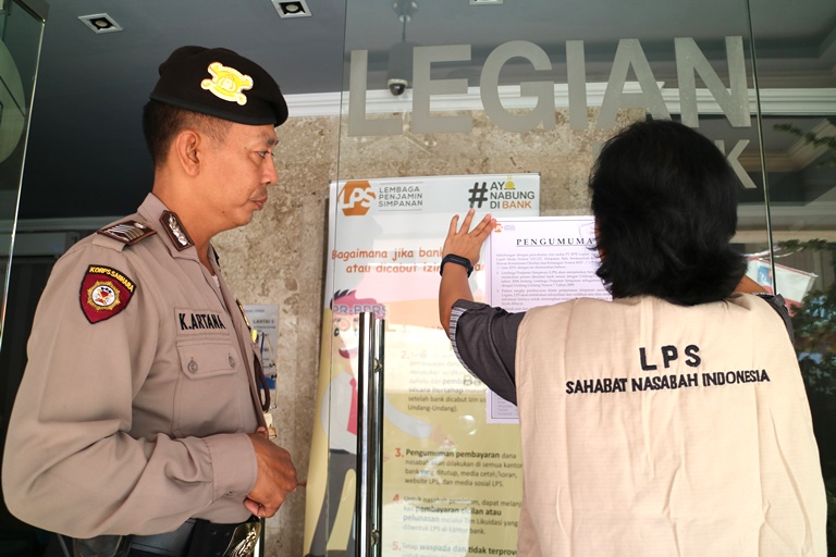 EKSEKUSI: Petugas Lembaga Penjamin Simpanan (LPS) dikawal polisi, sedang menyegel aktivitas bank bermasalah. (humas lps)