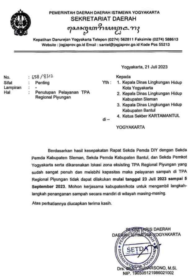 Surat yang ditandatangani Sekda Beny Suharsono menyebutkan rencana penutupan TPA Piyungan.