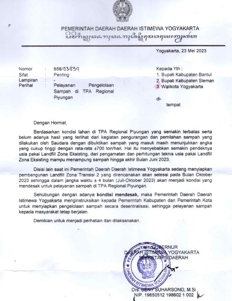 Surat bernomor 658/03894 perihal Pelayanan Pengelolaan Sampah di TPA Regional Piyungan.