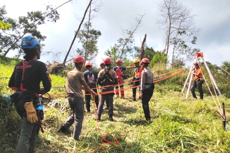 Sejak Selasa pagi hingga sore ini, puluhan personil gabungan berada di Watu Kemloso. Mereka memakai caveroll dan alat pelindung diri.