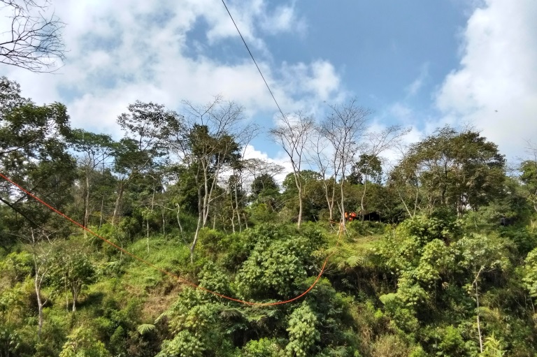 Tali yang dibentangkan di ketinggian 45 meter di atas sungai ini akan menahan beban sekitar 130 kilogram.