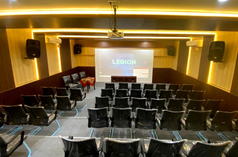 Di dinding kanan kiri terdapat speaker yang menghadap penonton, dan kursi theater yang nyaman.